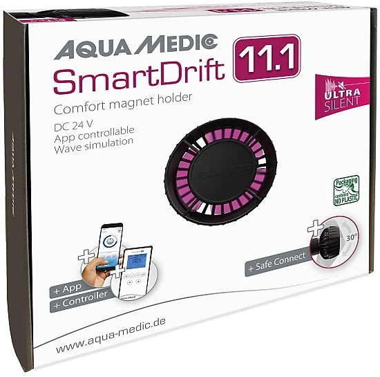 Aqua Medic SmartDrift 11.1 is a compact, powerful and very quiet flow pump for marine aquariums to create a soft flow. In addition to the included controller, the pump has an app control with smartphone or tablet to regulate the flow rate and wave frequency. The SmartDrift pump is a magnetically coupled current pump and very quiet in operation. It has a fully encapsulated synchronous motor. All materials are salt-water resistant. The pump is operated at 24 V DC safety voltage, with the power supply included. The pump is adjustable.